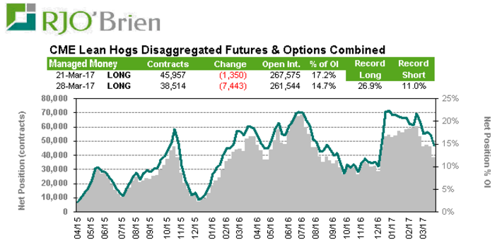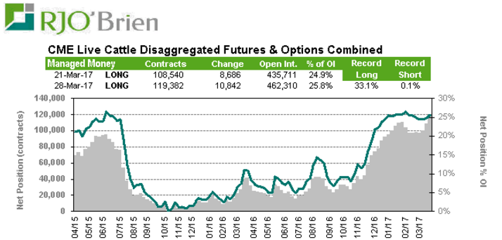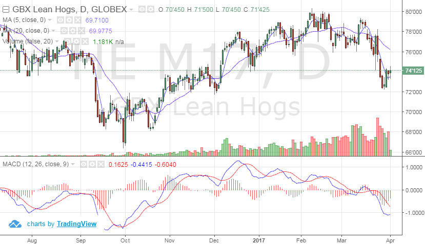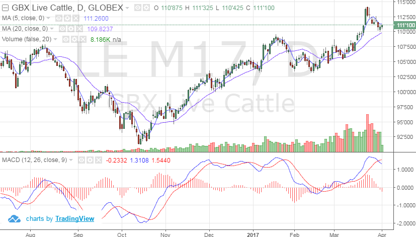 Lors de la dernière journée du 1er trimestre 2017, le prix du bœuf était plutôt silencieux avec pratiquement pas de variation sur l’ensemble des échéances. Possiblement que les yeux des traders étaient plutôt rivés vers les multiples rapports dans le marché des grains. Sur la semaine, le prix des contrats de bœuf était baissier en raison de la baisse du prix cash (-2¢/lb sur la semaine) et des prix des découpes ce qui resserre la marge des abattoirs. Vendredi dernier, le prix du Choice était de 214.12 (-1.09) ¢/lb et le Select était à 204.00 (-4.05) ¢/lb. Cela donne une marge presque nulle aux abattoirs ce qui pourrait affecter leur appétit, particulièrement si on se fie aux rumeurs que les abattoirs ont déjà un important volume d’acheté aux États-Unis.