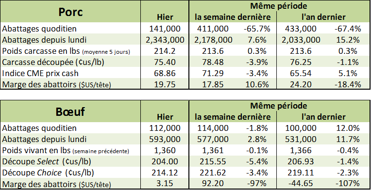 Pour la semaine finissant le 31 mars, les abattages de bœuf gras étaient de 593,000 têtes ce qui représente un léger recul de 3.3% par rapport la semaine précédente. Cependant, ce volume est 10% de plus qu’à la dernière semaine de mars 2016. Avec un poids moyen de 819 lbs carcasse, soit 11 lbs de moins que l’an dernier, la production hebdomadaire a atteint 484.6 millions lbs, soit 3.4% de moins que la semaine précédente mais 8.5% de plus que l’an dernier.