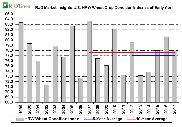 Pour un début avril, les conditions du blé hiver sont au dessus des moyennes et les projections de rendement 2017 demeurent élevés du moins il n’apparaît pas nécessaire de revoir le rendement "prévu" lors des prochains rapport USDA d'avril - beaucoup trop tot pour faire un changement à ce niveau.