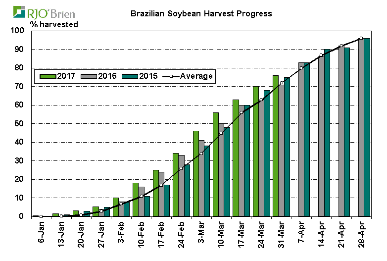 La récolte de soja au Brésil avance bon train, meme un peu plus vite qu'à l'habitude. La priorité est donné à la fève, car du coté du maïs c'est un petit retard sur les moyennes. Je vous rappelle que pour le maïs on parle de la première récolte, car il y en a deux récolte au Brésil. La deuxième qui s'appelle "Safrinha" qui veut dire petite récolte en portugais n'a rien de petit. En fait, la première et la deuxième récolte (Safrinha) sont quasiment égales en terme de production. Normalement les brésiliens utilisent la première récolte pour les besoins du pays, et par la suite pousse la deuxième vers l'exportation (quand il peuvent). Donc si la 1ere est bonne, on peut prévoir du stock disponible pour l'export via Safrinha pour l'été. Reste à savoir si Safrinha va bien. Enfin bref. Pour l'instant tout va bien, principalement du coté de la fève car dans le rapport hebdomadaire de Safras & Mercado (Consultant Agricole au Brésil) ils ont solidement haussé les prévisions de la récolte de soja à 111.5 millions de tonnes. Auparavant ils étaient à 107.1 MMT et l'USDA est à 108 MMT. C'est une augmentation de près de 15 millions de tonnes métriques par rapport à l'an passé, c'est énorme! Juste à titre indicatif, au Québec on a produit un récolte RECORD à 1 millions de tonnes. Juste l'augmentation de production entre 2016 et 2017 est 15 fois plus grande que notre propre production totale.