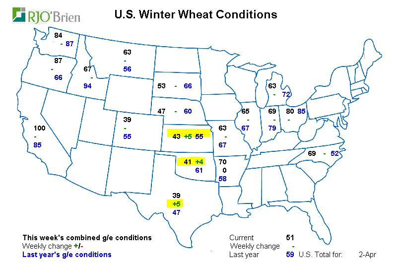 L'USDA a commencé a nous donné l'information sur l'état des cultures. Oui oui c'est bien le signe du printemps! Et aussi le BBQ. Et les playoffs du Canadiens! Pour l'instant les semis de maïs/soja n'ont pas suffisamment avancé nationalement (malgré le début bien amorcé au sud des USA) alors on surveille la qualité du blé d'hiver qui sort de dormance. Les conditions sèches des dernières semaine faisaient craindre une baisse de la qualité mais le retour de la pluie a su revigorer les cultures. On note une amélioration massive au Kansas, Oklahoma et Texas (les plus gros producteurs de blé d'hiver). L'USDA considère que 51% du blé est de bonne ou excellente condition par rapport à 59% l'an passé lors des records de rendements.