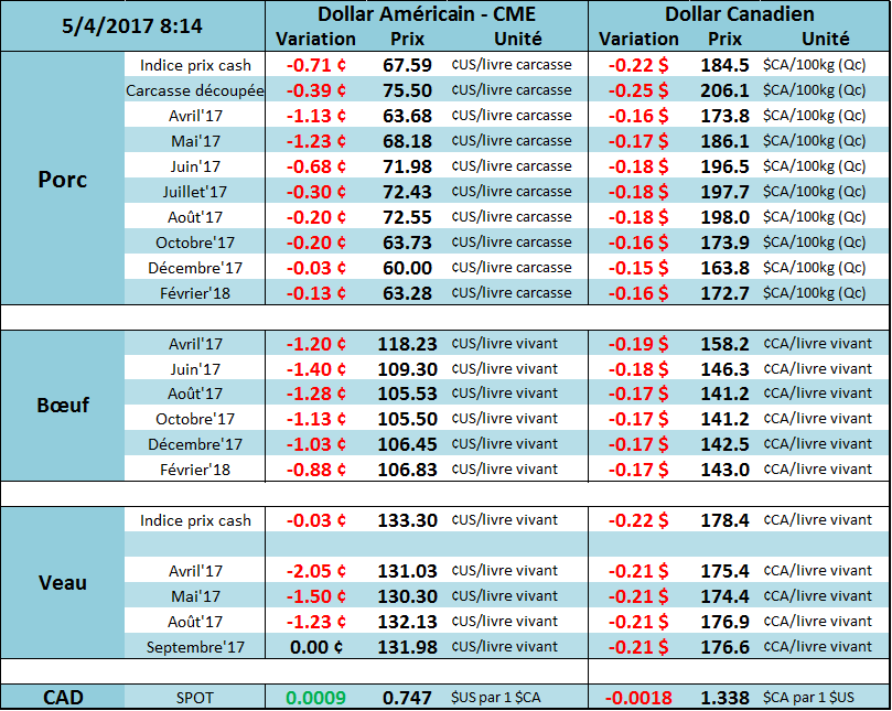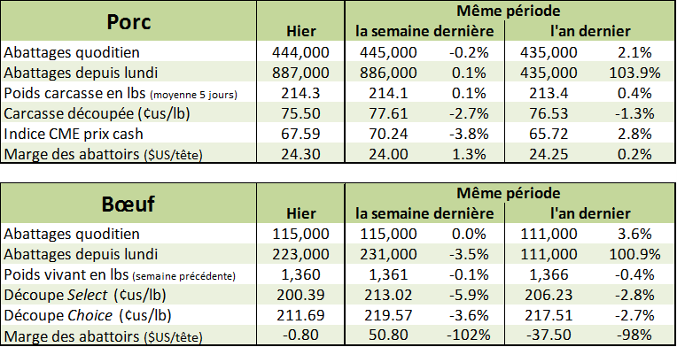 Pendant ce temps, les prix des découpes continuent leur chute, malgré un rebond en début de matinée. Le rapport de fin de journée nous indiquait une baisse de 1.74 ¢/lb pour le Choice et 0.96 ¢/lb pour le Select. Aujourd’hui, on surveillera l’encan électronique afin de voir si la pression du prix des coupes pèse sur le prix cash.