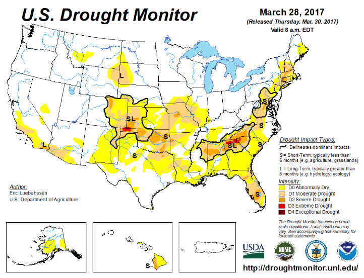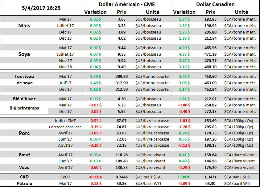 Coté météo, on annonce des pluies aux USA. Puise qu’on est encore tôt en saison les pluies sont plutôt bien vues pour améliorer la qualité des sols. Évidemment le printemps est une période clé pour le marché alors on surveille de près la situation pour déceler un retard de semis. Donc pour l’instant la pluie est bonne, la chaleur annoncée devrait faire sécher les champs rapidement et aider la germination des semis hâtif.