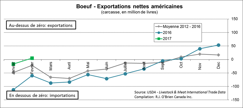 En février, les États-Unis ont exporté un net de 5 millions de livres avec 205 millions exportées et 200 millions importées. Comparativement aux 2 dernières années, c’est la première fois qu’on a des exportations nettes durant les mois de janvier-février. C’est principalement les importations qui ont diminué avec de très faibles volumes en provenance d’Australie à 31 millions lbs versus 54 M et 70 M en 2016 et 2015 respectivement. Au niveau des ventes, c’est le Japon qui était le plus gros acheteur avec 64 millions de lbs.