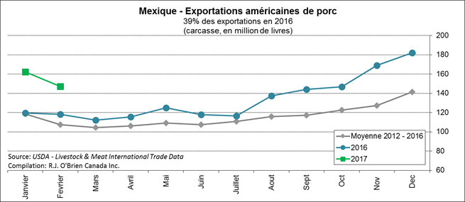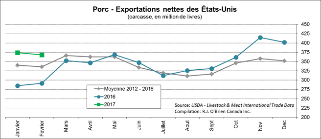 En février, les exportations nettes de porc étaient de 368 millions de livres ce qui représente une augmentation de 11.6% versus l’an dernier. Les exportations furent de 450 M lbs et les importations de 82 M ce qui donne un nette à 368 M lbs exportées. Si les exportations se portent bien, c’est essentiellement grâce au Mexique qui a acheté 147 millions de livres en février ce qui est 25% de plus que l’an dernier. La Chine achète toujours timidement avec 44.6 millions lbs.