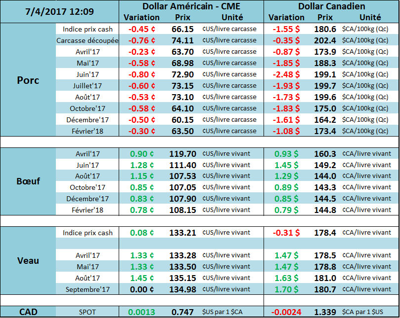 Hier, le prix du porc avait bondit grâce au prix des découpes qui affichait un gain en matinée et était de retour au-dessus de 75.00 ¢/lb. De la sorte, le CàT de juin a confirmé son support à 72.00 qui n’a toujours pas été brisé. Cependant, la valeur de la carcasse découpée n’a pas fini la journée dans le vert et est à peine au-dessus de 74.00 ¢/lb soit le plus bas niveau en 6 mois. C’est le bacon qui a perdu le plus à -5 ¢/lb à 122 ¢/lb ce qui représente une importante baisse depuis le mois de février. Suite à la faiblesse des découpes, le prix à la bourse s’est réajusté ce matin en ouvrant à la baisse. On perd environ une demie ¢/lb sur l’ensemble des mois. Le prix cash pour la journée d’hier était à 65.66 ¢/lb (-0.44) ce qui donnera un indice CME à 65.73 (-0.42) lundi matin.