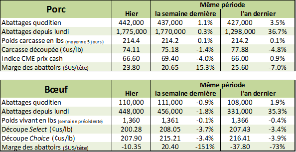 Le prix du boeuf est à la hausse pour une 2ème journée consécutive avec un gain d’environ 1 ¢/lb, malgré le prix des coupes qui continuent de chuter. Pour la journée d’hier, le prix du Choice était de 207.90 (-1.81) et le Select à 200.28 (-0.23) ¢/lb. En conséquence, la marge des abattoirs s’érode et est estimée à -10 $US/tête comparativement à +20.40 $US/tête la semaine dernière.