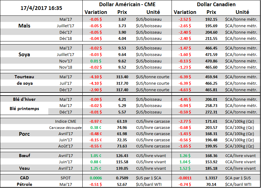 Les membres de la NOPA ont rapporté l’utilisation de 153 millions boisseaux de soya pour les activités de trituration en mars. C’est nettement moins qu’anticipé par les analystes qui s’attendaient à 156.7 millions, soit le même volume que l’an dernier. C’est le deuxième mois consécutif que le volume trituré est inférieur à 2016. Malgré la plus petite production de tourteau, le prix n’a pas résisté à la pression baissière du complexe des grains et a terminé la journée en baisse de 4.5 $US/tonne courte. Même avec les opérations de trituration plus faible, les inventaires d’huile sont de retour au-dessus de 1.8 milliard de livres indiquant un ralentissement de la demande.