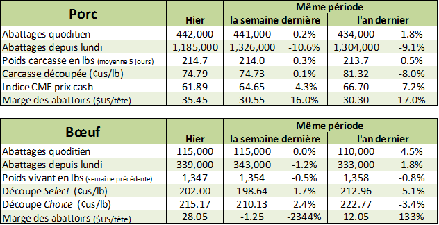 Le marché du porc a connu la même histoire hier que la vieille. Le prix des découpes était fort en matinée alors que la statistique d’après-midi était décevante ce qui a amené beaucoup de vendeur à l’ouverture des marchés. Malgré le faible du marché d’hier, le prix a fait un nouveau bas à l’ouverture et est presque 1¢/lb en dessous de la fermeture d’hier. Le prochain support est un peu au-dessus de 68 ¢/lb sur juin alors que nous sommes à 69¢/lb présentement. Les données du prix cash indiquait une stabilisation autour de 62.00 – 61.75 ¢/lb, mais la donnée de ce matin pour les ventes d’hier démontre que la baisse du cash n’est pas terminé ce qui propulse les CàTs à des nouveaux bas. L’indice CME sera à 61.59 (-0.31) demain matin. Fort possiblement que le marché attend de voir un revirement sur le marché cash avant de regagner confiance sur les livraisons d’été. Pendant ce temps, le prix des découpes est stable à 75.00 ¢/lb ce qui cause une augmentation de la marge des abattoirs qui est à 35 $US/tête.