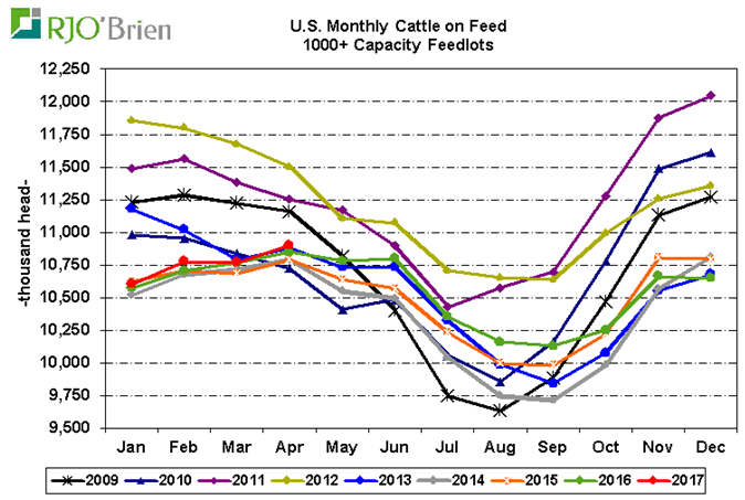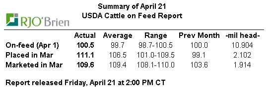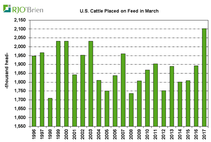 En date du 1er avril, il y avait 10.9 millions de boeufs en parc d’engraissement ce qui représente une augmentation de 0.5% versus l’an dernier, alors que le marché s’attendait à une baisse de 0.3%. Le rapport s’avère légèrement négatif pour les prix. L’augmentation du cheptel en parc durant le mois de mars est contre la tendance saisonnière puisque normalement, le troupeau diminue entre février et août. La surprise est au niveau des placements avec 2.1 millions de veaux d’embouche ce qui est un record historique pour cette période de l’année. Ça représente une augmentation de 11.1% par rapport l’an dernier et dépasse largement la moyenne des estimés de +6.5%. Comme d’habitude, le nombre de bœuf qui ont quitté les parcs est en ligne avec les abattages du mois, à +9.6%.