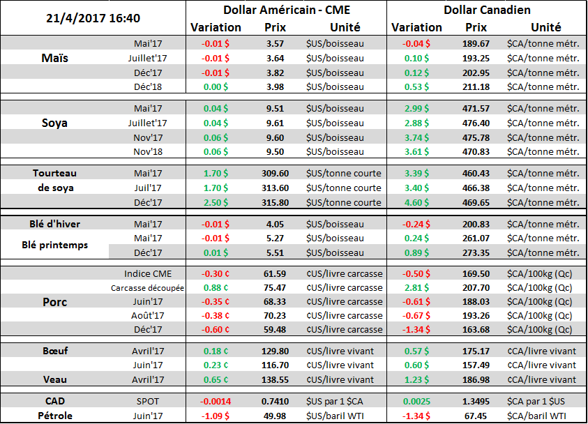· Fève soya : Pour le Canada, les surfaces devraient augmenter de 27% par rapport 2016 à 7 millions acres ce qui est record. Au Québec, la culture du soya devrait se faire sur 926 000 acres ce qui est 15% de plus que l’an dernier.