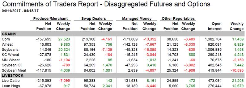 Entre le 11 et 18 avril, c’est sans surprise qu’on apprend que les spéculateurs ont vendu des contrats de grains puisque les prix étaient plutôt baissiers. Ils augmentent donc leur position vendeur sur les marchés de grains alors que la météo commencera à perturber les marchés dans les prochaines semaines. Ils ont vendu pour 13 400 CàT de maïs portant leur position à 172 000 CàT vendus. Dans le blé, ils ont vendu 7 700 CàT pour un total de CàT vendu à 142 000. Le contrat de fève soya fût le plus vendu avec un net de 16 000 CàT, pour un total de 46 000. Dans la viande, les spécualteurs ont vendu 6 500 CàT de porc et acheté 8 000 CàT de bœuf.