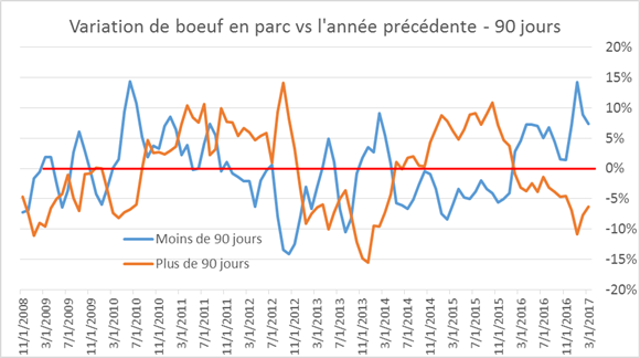 Le troupeau en parc reste relativement jeune. Alors qu’il y a seulement 0.5% plus de bœuf en parc que l’an dernier, il y en a 7.4% plus pour la portion en parc depuis moins que 90 jours. À l’inverse, il y a 6.3% moins de bœuf en parc versus l’an dernier pour ceux en parc depuis plus de 90 jours.