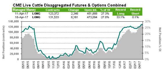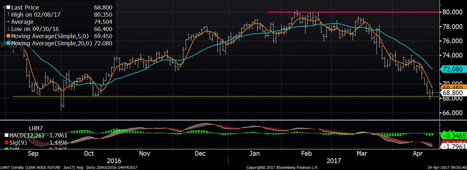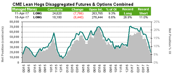 Les abattages de porcs continuent de surpasser la quantité de l’an dernier avec 2.29 millions de têtes ce qui est 2.4% de plus que l’an dernier. Le poids est tout juste sous le niveau de l’an dernier et la production a atteint 486.5 millions de livres ce qui représente une progression de 3.0% versus l’an dernier. Entre le 12 et 18 avril, les spéculateurs ont vendu un total de 6 440 CàT pour diminuer leur position long à seulement 18 000 CàT. De plus, pour la période du 19 au 25 avril, ça ne serait pas surprenant que la liquidation ait continué.