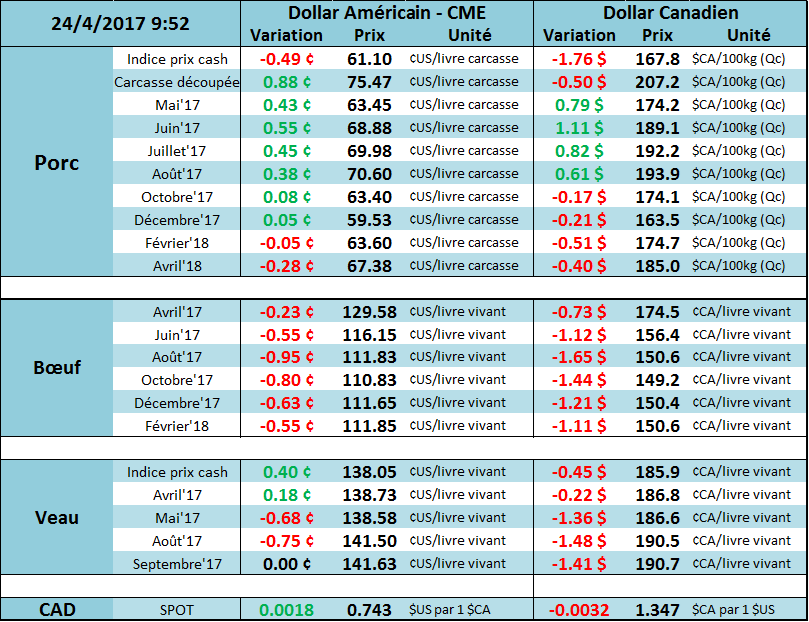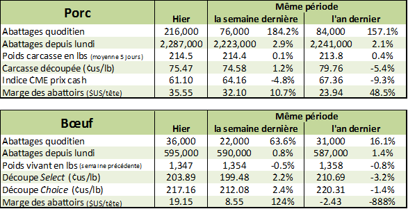 Ce matin, le marché a ouvert à la baisse de 1 ¢/lb sur août suite au résultat négatif du rapportCattle-on-Feed qui indiquait plus de placement en mars ainsi qu’un plus gros troupeau en parc qu’anticipé. Juste avant le rapport, les prix des contrats à terme avaient atteint un nouveau sommet vendredi. Le prix des coupes continue d’augmenter avec le Choice à 217.16 ¢/lb (+1.44) et le Select à 203.89 ¢/lb (+0.32).