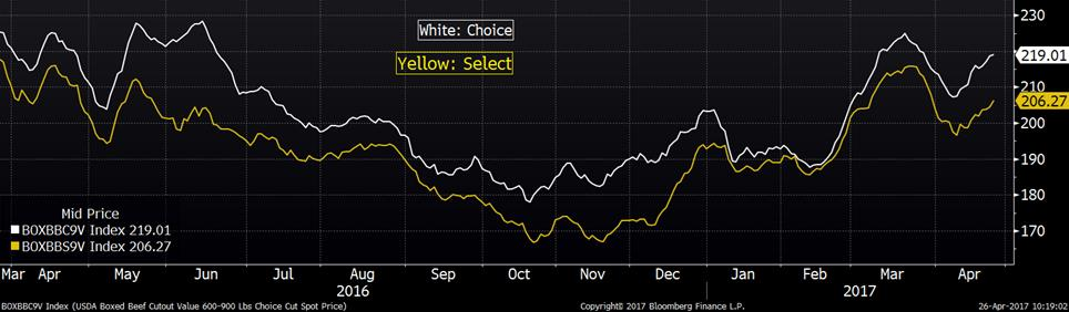 La journée négative de lundi fût rapidement oubliée. Hier, les contrats d’été ont gagné une cent la livre et ce mouvement continue ce matin ce qui permet de retourner près du sommet de la semaine dernière. L’élément positif reste le prix cash qui ne baisse pas malgré la pression saisonnière. Le contrat d’avril qui expire officiellement vendredi, est rendu à 130.8 ¢/lb pour rejoindre le prix comptant. Le prix des découpes monte également de +0.34 ¢/lb à 219.01 pour le Choice et de +1.98 ¢/lb à 206.27 pour le Select.