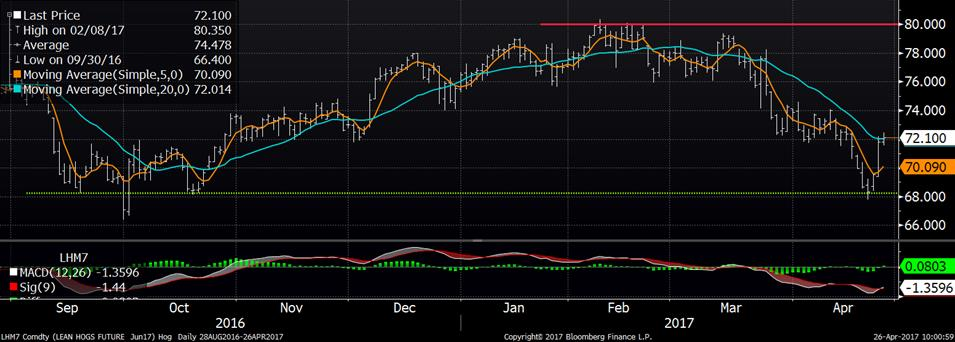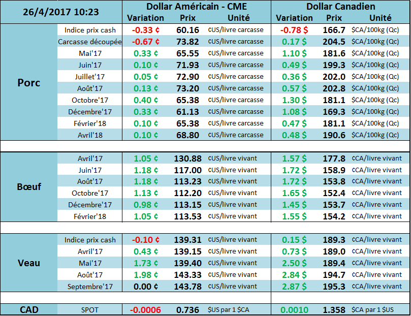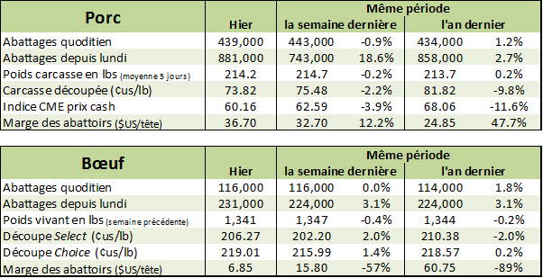 Le prix du porc a très bien réagi hier suite à la publication du rapport Cold Storage démontrant des inventaires surgelés plus faible qu’anticipés ce qui indique une forte demande en mars. Le prix a terminé à la hausse de +2.3 ¢/lb sur juin à 71.83, de +2.45 ¢/lb sur juillet à 72.85 et de +2.2 ¢/lb sur août à 73.08. Le mouvement est assez fort et opposé à ce qu’on voit sur le marché cash. Avec des abattages très élevés en début de semaine, à 881 000 tête en 2 jours versus 854 000 l’an dernier, le prix cash diminue toujours et le prix des découpes atteint un nouveau creux. En effet, le prix de la carcasse découpée a perdu 0.67 ¢/lb à 73.82 suite à la perte de 4% du prix du bacon qui continue de chuter, présentement à 106.55 ¢/lb. Depuis son sommet en février, la valeur du bacon a chuté de 42%. Ce matin, les prix ont ouvert à la hausse de 0.5 ¢/lb, mais semble avoir de la difficulté à garder le momentum des 2 derniers jours.