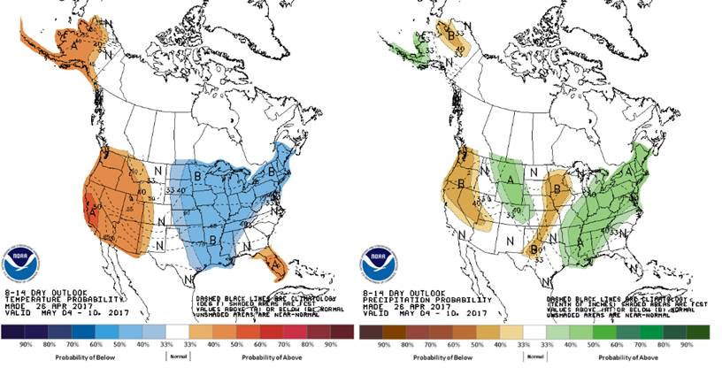 Les semis américains sont partis, le rythme est plus lent que l’an passé mais demeure dans les moyennes des dernières années. Par contre les cartes météos montrent de la pluie et le retard va s’accentuer.