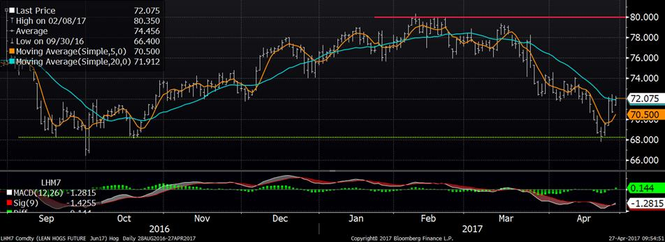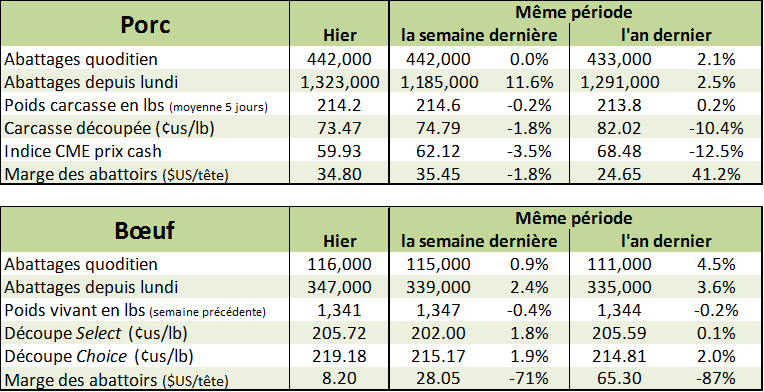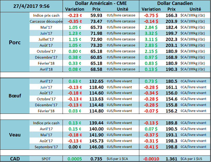 Malgré un début de journée dans le vert, les prix se sont repliés après de mauvaises nouvelles sur le prix des découpes. La carcasse découpée a atteint un nouveau creux à 73.47 ¢/lb (-0.35), cette fois ce sont les prix de la longe et du jambon qui ont diminué de plus d’une cent la livre. Puisque ces 2 coupes représentent la moitié de la carcasse, c’était inévitable que la valeur de la carcasse découpée suive le mouvement. Conséquemment, le marché à terme a perdu la moitié de l’appréciation de mardi avec une baisse de 1.1 ¢/lb à 71.75 ¢/lb. D’un point de vue optimiste, le prix comptant baisse très tranquillement et semble atteindre son creux juste en-dessous du 60 ¢/lb. Cela redonne confiance quant aux prix pour cet été lesquels ont ouvert avec un gain de 1.3 ¢/lb ce matin.