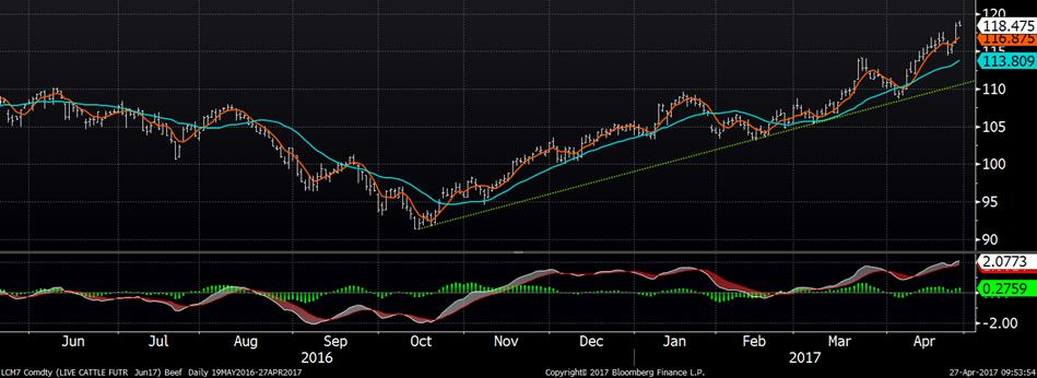 À voir les prix qui ont terminé la journée près du « limit up », ce n’est pas une surprise de dire que le résultat de l’encan électronique était positif pour les prix. Sur les 5448 bœufs offerts, il y en a 1945 qui ont trouvé preneur. Pour les livraisons dans 1 à 9 jours, les prix moyen était de 131.68 ¢/lb. Pour les livraisons dans 17 à 30 jours, le prix moyen était de 129.89 ¢/lb. Pour les livraisons dans 17 à 30 jours, le prix moyen baisse à 125.42 ¢/lb. Cela a permis d’oublier l’offre de viande abondante à venir, dévoilée dans le rapport Cattle-on-feed, et de focuser sur la forte demande. Les prix à la bourse ont atteint un nouveau sommer avec le CàT de juin à 118.53 ¢/lb et août à 115.05 ¢/lb.