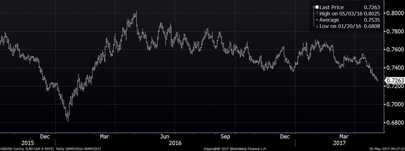 Ce matin, le taux CAD/USD atteint son plus bas niveau en plus de 14 mois à 0.726 $US par 1 $CA, mais remonte depuis. Pour l’instant, rien n’indique qu’on a touché le creux et hier était la 10ème journée consécutive que notre devise se dévalue face au dollar américain. Plusieurs facteurs négatifs se sont enchainés pour créer ce mouvement baissier. Premièrement, le pétrole ne cesse de baisser lequel a atteint cette nuit son plus bas niveau depuis novembre 2016, à 43.76 $US/baril, c’est presque 20% de baisse en 3 semaines. La valeur des métaux a aussi reculé depuis quelques semaines. Deuxièmement, les déboires financiers de Home Capital Group, un prêteur hypothécaire qui est en difficulté, crée un environnement d’incertitude autour du système financier canadien et a engendré une baisse de la valeur des 6 grandes banques. Troisièmement, les menaces de Trump face à l’ALENA augmentent le climat d’incertitude face à l’économie canadienne. Aussi, si jamais le projet de Trump est accepté concernant la baisse du taux d’imposition des entreprises à 15%, cela pourrait engendrer une baisse des investissements au Canada puisque les entreprises payeraient moins de taxes au sud de la frontière. Avec tous ces évènements, les probabilités de voir une hausse de taux d’intérêt en 2017 au Canada ont reculé de 50% en mars presque zéro présentement. Tout cela vient expliquer pourquoi nous sommes rendus avec le taux de change au niveau actuel… cependant, pour voir des niveaux encore plus bas, il faudra que la situation continue à se détériorer. En 2016, lorsque le dollar était à 0.68 $US, le marché établissait la probabilité de voir une baisse du taux d’intérêt durant l’année à presque 90%. Présentement, les probabilités de voir une baisse de taux au Canada est de 0% pour 2017, le marché n’est donc pas aussi pessimiste qu’il était face au Canada en janvier 2016.