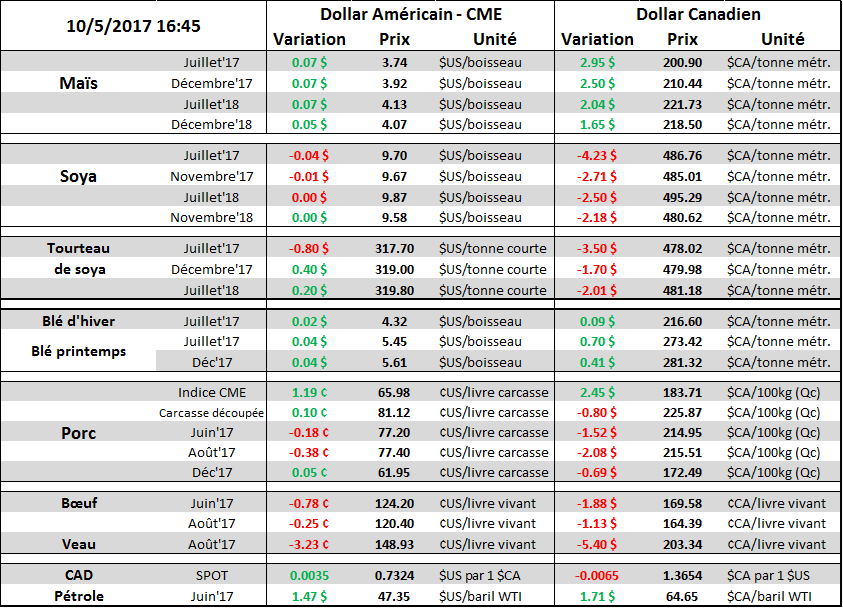 Maïs: Meilleure consommation sur l'ancienne récolte, mais 25 millions c'est insuffisant pour ébranler le bilan. Pour la nouvelle récolte l'offre n'a pas été abordée, évidemment, car il est trop tot pour faire quelconque ajustement. On a donc les surfaces annoncées en mars (Prospective Plantings) avec un rendement statistique de 170 bu/ac. Rien de surprenant. En fait on était plus attentif à savoir comment le ministère allait attaquer le volet "demande" de ce bilan. Sur la nouvelle récolte on remarque l'augmentation cohérente pour l'éthanol et l'élevage, mais le plus pertinent est l'ajustement apporté à l'exportation. La demande pour l'exportation reculerait pour 2017/18 compte tenu de l'ampleur des récoltes sud américaine. En fait, l'USDA nous rappelle que l'exportation actuelle (2.3 milliard) est inhabituelle/inespérée puisque les cultures Brésilienne l'an dernier on été désastreuse. Ainsi donc les américain ont su profiter d'une fenêtre d'opportunité qui ne risque pas de se reproduire en 2017/18, toujours selon l'USDA.
