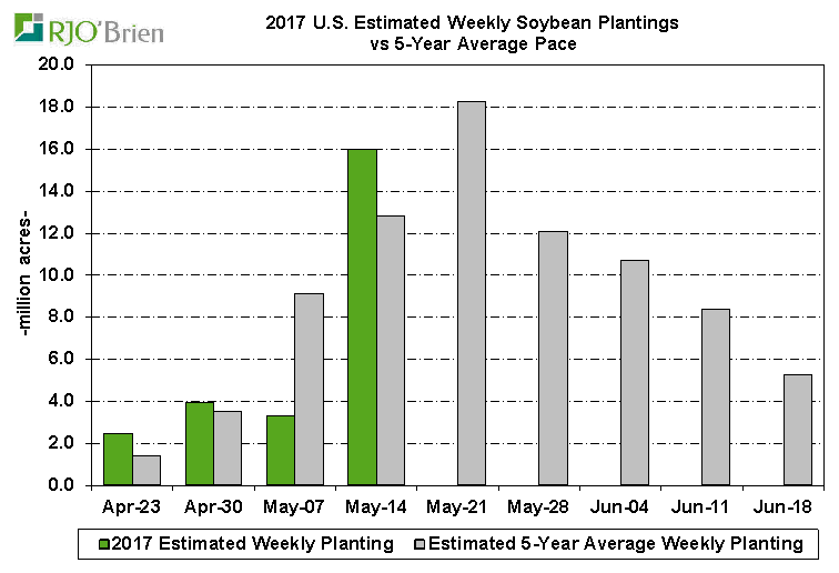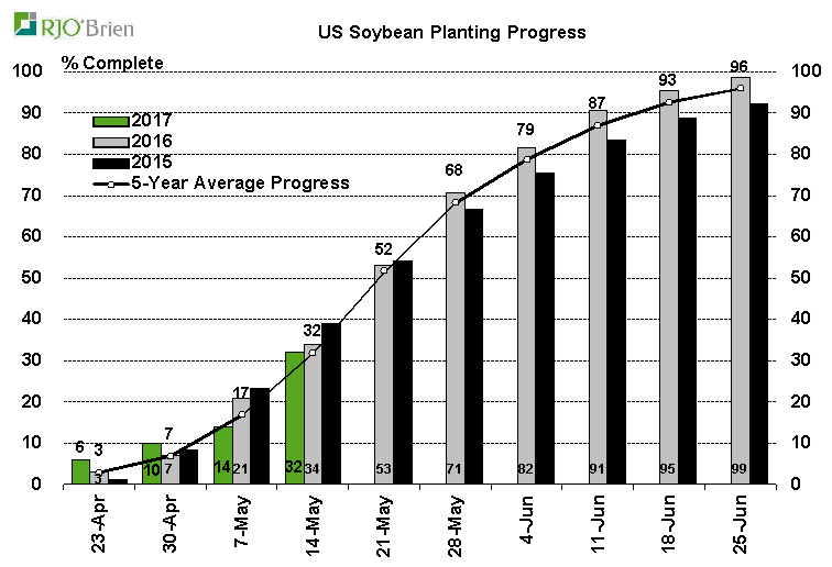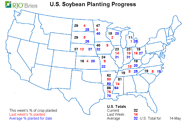 · Semis de soja : 32% complété vs 34% l’an passé et 32% en moyenne