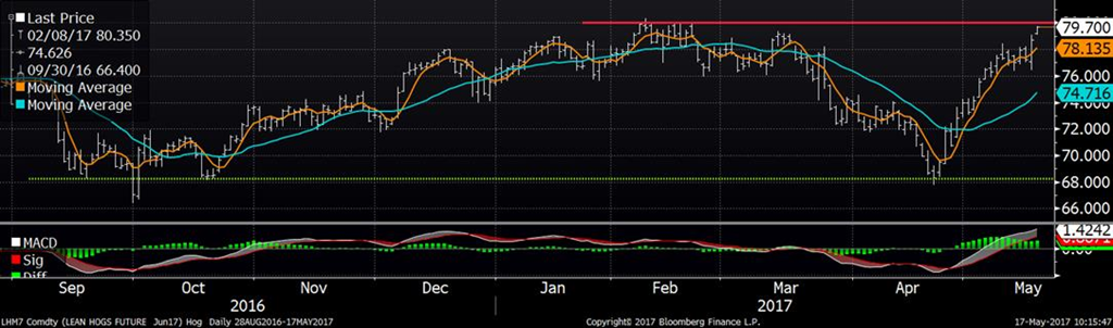 Le marché du porc a continué son ascension printanière grâce à un prix cash et des découpes qui ne cessent de s’apprécier. Pour la journée du 15 mai, le prix cash était de 73.74 ¢/lb, en hausse de 1.33 ¢/lb, ce qui confirme que la tendance ne ralentie pas pour le moment et donne un élan au CàT de juin. En plus de fermer à son plus haut niveau depuis 2 mois, le CàT de juin a ouvert ce matin avec un « gap » haussier et est présentement nez-à-nez avec la résistance et niveau psychologique du 80 ¢/lb. Si on perce ce niveau, ça serait un signal d’achat et pour cette raison, on préfère attendre avant de faire des ventes de porc pour 2017. Cependant, une stratégie possible afin de profiter du faible dollar canadien serait de fermer des CàT de CAD pour septembre et décembre, et laisser monter le prix des CàT de porc avec un objectif autour de 195 $CA/lb sur octobre et 180 $CA/lb sur décembre.