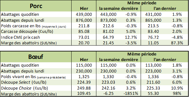 La valeur de la carcasse découpée a gagné 1.11 ¢/lb ce qui permet aux abattoirs de garder une marge de plus de 20 $US/tête. En autant que la valeur de la découpe monte au même rythme que le cash, le potentiel haussier du prix du porc vivant demeure présent. Cependant, lorsqu’on commencera à voir un ralentissement au niveau des découpes, il faut s’attendre à ce que les abattoirs seront un peu moins agressifs à enchérir.