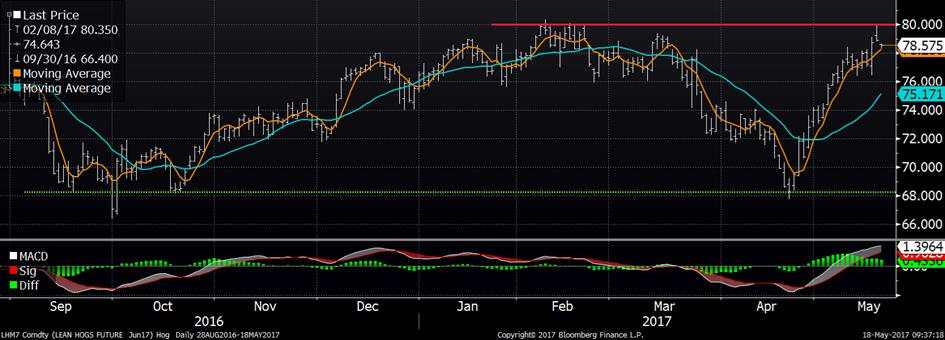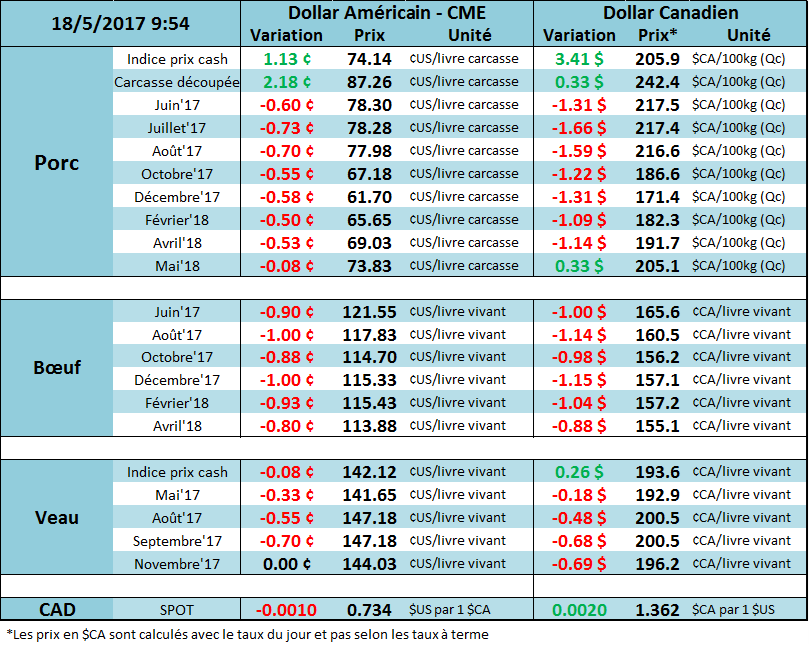Le marché du porc a touché un sommet en 3 mois hier, avec le contrat de juin qui a frôlé la barre du 80.00, avant de reculer en après-midi pour afficher un maigre gain de 0.17¢/lb. Les contrats de juillet et aout ont terminé la journée à la baisse de -0.47 et -0.15 ¢/lb respectivement. La force du prix d’hier provenait principalement de la valeur de la carcasse qui a bondit de 2.18 ¢/lb à 87.26 ¢/lb. Depuis 5 jours, on note une augmentation de 7.6% de la longe et de l’épaule qui sont les 2 principales coupes à augmenter. Ce matin, le marché a ouvert à la baisse dans la vague baissière des matières premières agricoles.