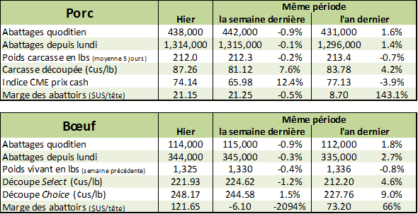 Cette semaine, il y a eu peu d’activité sur le marché cash. Hier, sur l’encan électronique du Fed Cattle Exchange, il s’est transigé 1621 têtes sur les 2379 offertes. Pour les livraisons de 1 à 9 jours, le prix moyen était de 135.16 ¢/lb, en baisse de 3.6 ¢/lb depuis la semaine dernière. Sur les plaines américaines, le prix cash demandé par les parcs d’engraissement seraient de 138 à 142 ¢/lb alors que les abattoirs veulent payer 130 – 131 ¢/lb, cet écart explique le faible volume sur le marché physique.