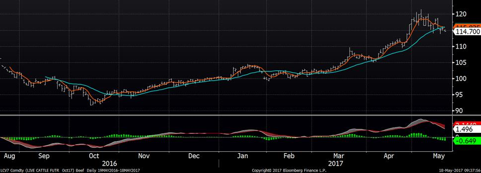 Hier, les marchés à terme de bœuf ont connu une séance légèrement positive malgré la baisse marquée du prix des découpes. L’ensemble des contrats a gagné une demie cent la livre pour terminer la journée à 122.45 sur juin, 118.83 sur août et 115.58 sur octobre. Du côté des coupes, le Choice a perdu -1.71 ¢/lb à 248.17 et le Select a diminué de -2.46 ¢/lb à 221.93.