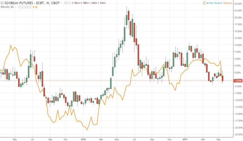 Corrélation entre devise Brésilienne (BRL/USD) et cours de la feve CBOT