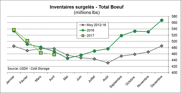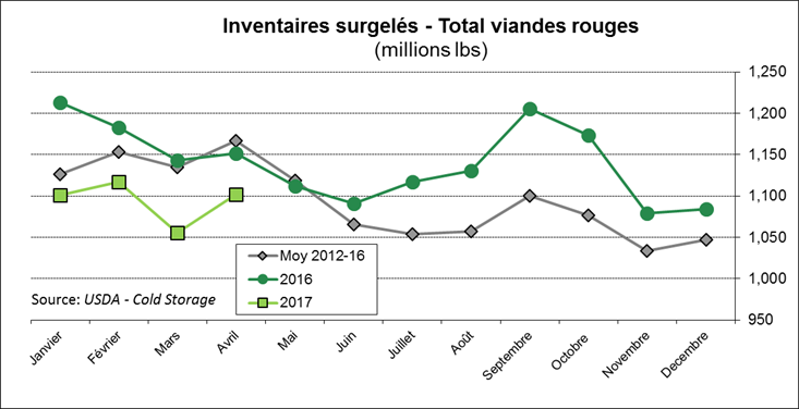 En avril, les inventaires surgelés de bœuf étaient de 458 millions lbs, c’est un léger recul depuis mars 2017 et avril 2016. La totalité des inventaires de viandes rouges est de 1.1 milliard de lbs ce qui amène les réserves à mi-chemin entre le mois dernier et avril 2016. Malgré la production élevée de protéine, les inventaires surgelés de viandes rouges restent nettement sous la moyenne des 5 dernières années.