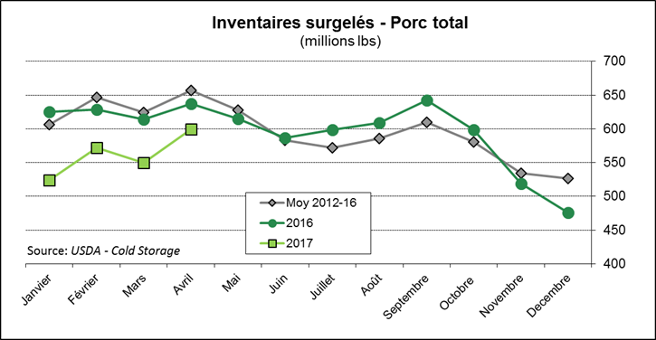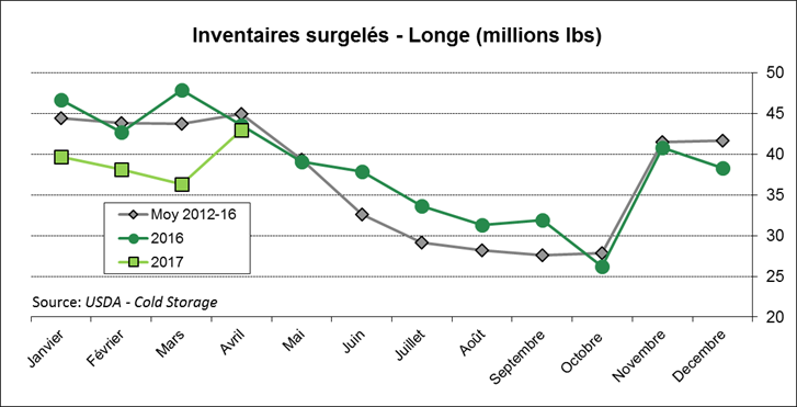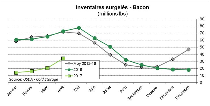 En avril, les inventaires de porc se sont reconstruits ce qui n’est pas une surprise avec la baisse du prix cash durant cette période. Les inventaires surgelés sont de 599 millions lbs au 30 avril ce qui est 50 millions de plus qu’en mars et on n’est que 6% sous les niveaux de l’an dernier, comparativement à -10.5% en mars. Les inventaires de bacon ont bondi de 66% depuis mars, à 34 millions de lbs, ce qui représente à peine la moitié des réserves de l’an dernier. On commencera donc la saison estivale avec des faibles inventaires de bacon ce qui pourrait faire considérablement augmenter les prix d’ici quelques semaines lorsque la demande sera forte. Les inventaires de longe ont aussi connu une forte progression passant de 36 à 43 millions de lbs, de retour au volume de 2016.