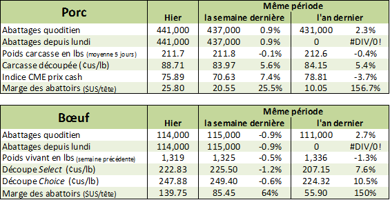 La semaine dernière, les abattages ont totalisé 2.25 million de porcs ce qui représente un petit repli de -0.4% versus la semaine précédente mais est 6.3% de plus que l’an dernier. Avec un poids moyen de 213 lbs/carcasse ou 284 lbs/vivant, la production est de 478.2 millions livres. C’est 6.4% plus de porcs que l’an dernier, c’est donc encourageant de voir le prix des découpes plus élevé que l’an dernier… la demande est forte.