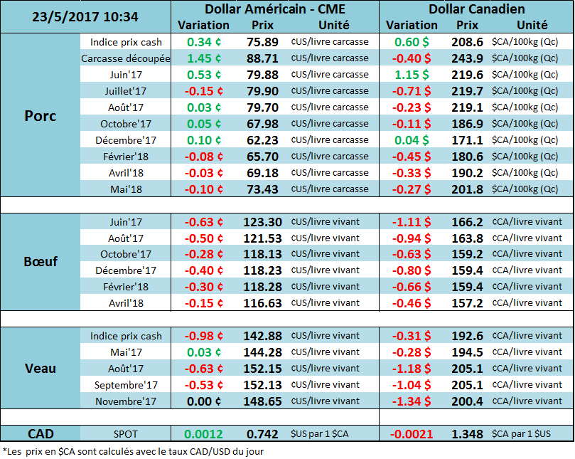 Après avoir établi un nouveau sommet hier, le CàT de porc sur juillet recule légèrement. La valeur de la carcasse découpée continue d’afficher des gains ce qui support les prix à la bourse. Le cutout pour la journée d’hier était à 88.71 ¢/lb (+1.45), un sommet depuis juillet 2016. Ce sont principalement la longe et le flanc qui s’apprécient ce qui démontre que la saison du BBQ est commencée! Toutefois, le prix cash de vendredi dernier (publié hier) était de 75.94, en hausse de seulement +0.11 ¢/lb. C’est l’élément qui préoccupe en ce moment et il faudra voir le prix cashreprendre de la vigueur pour espérer de voir les prix d’été surpasser la barre du 80 ¢/lb.