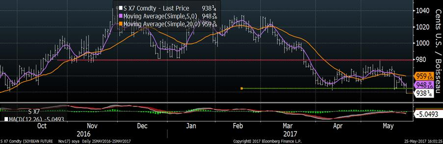 La crainte de voir le marché du soya envahi par les ventes brésiliennes pèse beaucoup sur le prix américain. Même si la devise brésilien s’est repliée depuis la panique du 18 mai, elle garde une dépréciation de 6% versus la semaine dernière ce qui accroît la compétitivité du Brésil. De plus, on note une bonne progression des semis ainsi que du « replantage » qui est nécessaire suite au problème météo au début du mois. Les compagnies de semences parlent d’une bonne année en vente de semences en raison du nombre élevé d’acres qui sont ressemés, il y aura possiblement peu de perte d’acréage. Bien que les prix du maïs et du blé se maintiennent dans la même zone depuis plusieurs semaines, la valeur du soya a atteint un nouveau creux aujourd’hui en clôturant à 9.39 $US/boisseau. Techniquement, ce n’est pas très positif puisqu’on vient de briser le support (ligne verte). L’analyse est réciproque en ce qui concerne le tourteau de soya.