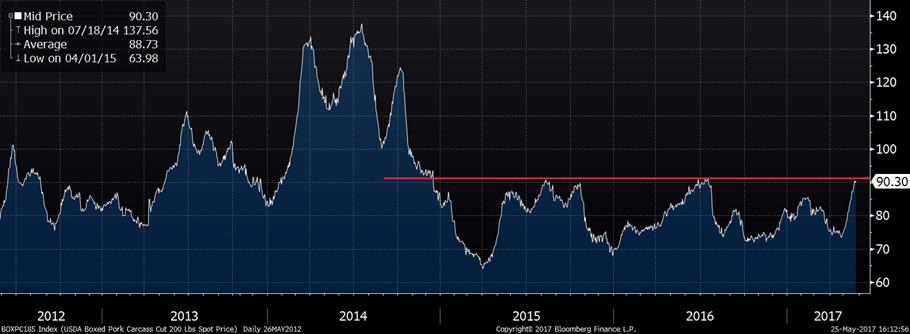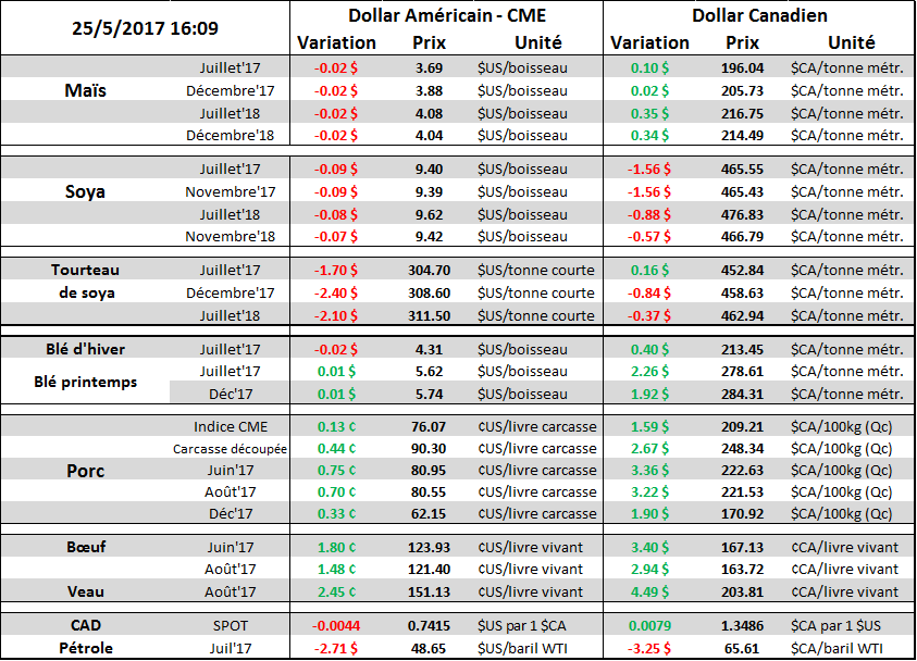 Dans le marché du porc, on constate que la demande est très forte malgré l’abondance de viande. La valeur de la carcasse découpée est de retour au plus haut niveau depuis juillet 2016 et à seulement 1¢/lb d’un sommet en 30 mois (décembre 2014). Bien que la force du marché des découpes ne se reflète pas totalement dans le marché cash lequel stagne à 76 ¢/lb depuis quelques jours, le marché appréhende un gain de 5¢/lb au cours des 3 prochaines semaines afin d’aller rejoindre le CàT de juin qui est à 80.95 ¢/lb. C’est la première fois cette année que tous les contrats d’été ont terminé la journée au-dessus de la barre du 80 ¢/lb.