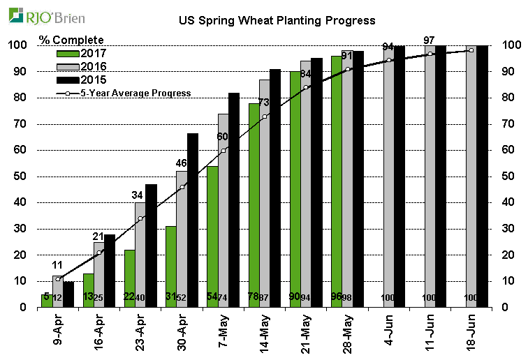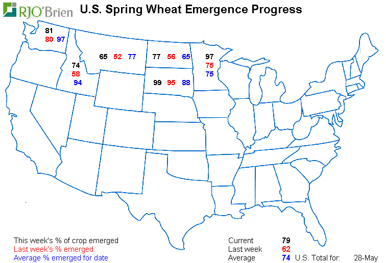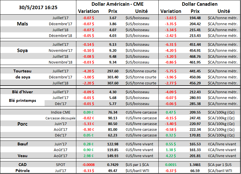 La condition nationale U.S. du blé d’inde est évaluée à 65% bon/excellent, soit le plus faible score depuis des années et nettement sous l’indice à pareille date l’an dernier (72%). Coté semis on est rendu à 91% en ligne avec les moyennes et les attentes. La météo cette semaine dans l’est du cornbelt sera plus clémente et devrait permettre le travail au champ. Le plus pertinent à retenir sur les conditions dans le maïs c’est que la corrélation entre la donnée d’aujourd’hui et le rendement final à l’automne est très faible, voire nulle. Le blé d’inde pourrait être très beau comme en 2012 et finir avec le pire rendement en plus d’une génération….