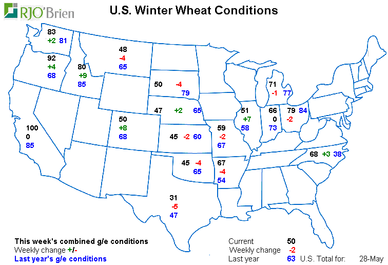 · Blé hiver : condition à 50% bon/excellent vs 52% semaine dernière et 63% l’an dernier