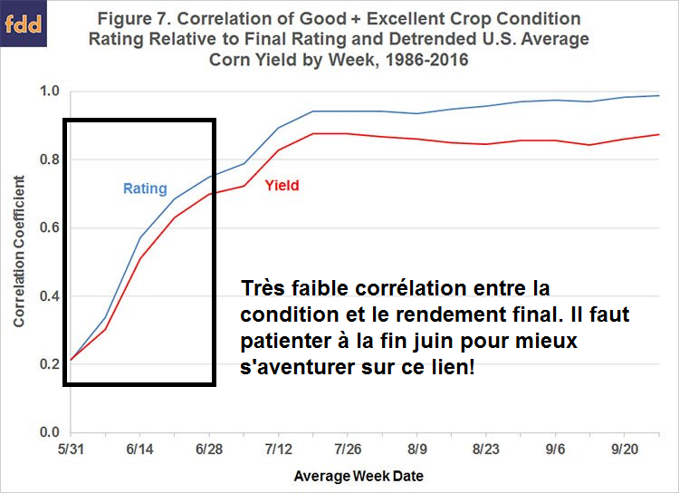En consultant les recherches de l’université d’Illinois, on constate que la condition des récoltes est très peu importante avant la fin juin.
