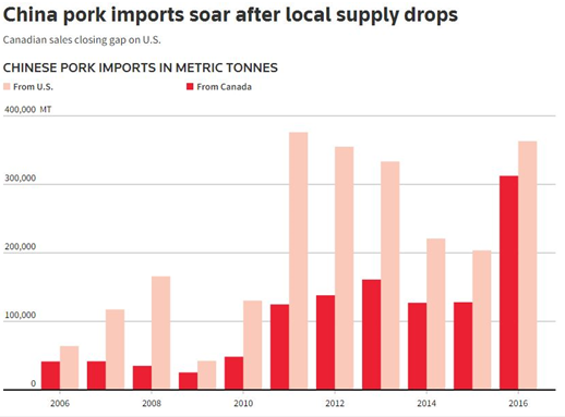 Le marché du porc recul légèrement après avoir touché un sommet le 31 mai. La vitesse à laquelle le prix cash s’apprécie met un peu d’incertitude, mais sinon, le fondamental semble plutôt positif avec la valeur de la carcasse découpée à 91.4 ¢/lb et la marge des abattoirs à +28.6 $US/tête. Selon les chiffres d’exportations du Canada, pour le 1er trimestre 2017, les exportations canadiennes de porc vers la Chine sont rendues supérieures aux exportations américaines. Les ventes canadiennes vers la Chine avait énormément augmenté en 2016 (voir graphique plus bas) et ont continué à croître. La Presse a également commenté les données : http://affaires.lapresse.ca/economie/agroalimentaire/201706/03/01-5104090-les-chinois-triplent-leur-consommation-de-porc-quebecois.php
