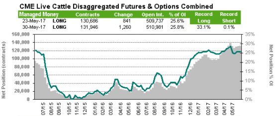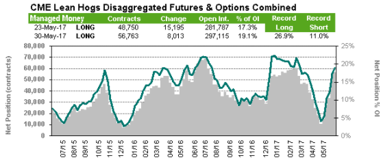 Entre le 24 et 30 mai, les spéculateurs ont continué à acheter des CàT de porc pour un total de 8 013 CàT ce qui donne une position nette de 56 763 CàT. En comparant à la quantité de contrats qu’ils détenaient l’été dernier et en février, il resterait encore de la place pour qu’ils ajoutent des achats supplémentaires si les conditions du marché demeurent haussières.