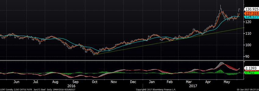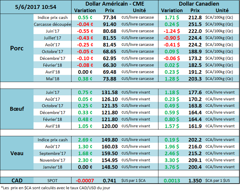 Le contrat de juin a continué sur sa lancée vendredi avec un gain de +3.40 ¢/lb. Puisque le prix de l’échéance de juin avait atteint la limite de +3.00 ¢/lb jeudi, la limite journalière était rendue de +4.5 ¢/lb pour vendredi. L’explosion du prix du contrat de juin est expliquée par la même force sur le marché cash, ce qui influence un peu moins les échéances plus loin. Vendredi, le CàT d’août a terminé la journée à 126.05 (+1.35) et octobre à 121.10 (-0.05) ¢/lb. On peut s’attendre à voir encore de la volatilité cette semaine alors que le marché à terme est à rabais par rapport le prix cash ainsi que la marge des abattoirs est élevée à +162 $US/tête. Le marché a ouvert inchangé ce matin avant que le contrat de juin continue de monter à +1.4 ¢/lb à 11h00.