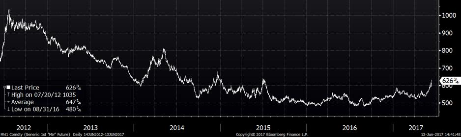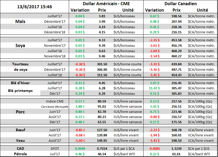 Tel que mentionné dans notre commentaire d’hier, la qualité du blé de printemps a fortement chuté avec seulement 45% des surfaces en bonne ou excellente condition, comparativement à 79% l’an dernier. Face à cette information, le prix a réagi avec un gain de 4.5% sur les échéances de juillet et septembre. La structure des prix démontre bien qu’une rareté s’installe dans le marché du blé riche en protéine : contrairement aux autres grains, le prix de l’échéance de septembre (6.34 $US) est plus élevé que ceux de décembre (6.29 $US), mars (6.25 $US) et mai (6.19 $US). C’est ce qu’on appelle un marché en « backwardation » et signifie que les utilisateurs sont prêts à payer une prime plus élevée pour détenir le blé immédiatement plutôt que dans 6 mois afin de s’assurer de leur approvisionnement. Normalement, lorsque la structure des prix change ainsi, c’est positif pour les prix et particulièrement pour les échéances les plus rapprochées. Grâce à la force du marché du blé de printemps, le prix du blé d’hiver a également augmenté ce qui a entrainé le maïs à la hausse.