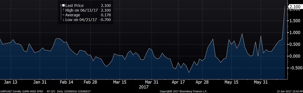 Le marché du porc a récupéré une partie des pertes de lundi avec le CàT de juillet qui a clôturé à 82.28 ¢/lb (+1.58). Le prix cash d’hier fût publié à 81.58 (+0.80) ce qui donnera un indice CME à 81.16 ¢/lb demain matin. Demain sera la dernière journée du CàT de juin qui a terminé la journée à 82.78 ¢/lb alors qu’il reste seulement 2 publications du prix cash avant de pouvoir déterminer son prix de règlement. Le marché anticipe donc une augmentation moyenne du prix cash de +0.81 ¢/lb pour aujourd’hui et demain. Ce vent d’optimisme provient de la publication de la valeur de la carcasse découpée qui était de 95 ¢/lb en matinée, presque 2 ¢/lb de plus que la vieille. Cependant, on n’a pas vu la même vigueur sur les CàT au-delà de l’échéance de juillet avec le mois d’août qui a gagné seulement 0.22 ¢/lb. L’écart entre les prix de juillet et août a littéralement explosé à 2.1 ¢/lb (voir graphique ci-dessous). Cela revient à dire que le marché s’attend à ce que le prix cash faiblisse vers la fin de l’été, possiblement que le spectre de l’été dernier vient hanter le contrat d’août qui avait terminé à 67¢/lb.