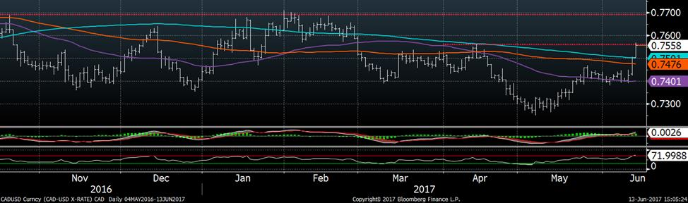Le dollar canadien a poursuivi son rallye jusqu’à 0.757 $US par 1 $CA ce qui est le plus haut niveau depuis 3.5 mois. On teste actuellement le sommet du mois d’avril à 0.756. Techniquement, si le taux parvient à percer cette résistance, la prochaine cible serait 0.77 $US. En plus du discours d’hier de Wilkins (voir lettre d’hier), le gouverneur Poloz a confirmé les dires de sa collègue à propos de l’objectif de la Banque Centrale du Canada de réduire éventuellement les stimuli monétaires, se traduisant par une hausse du taux directeur. Vendredi dernier, les probabilités de voir une hausse du taux directeur en 2017 était seulement de 30%. Cette probabilité a bondi à 64% aujourd’hui dont 17% de probabilité de voir 2 hausses d’ici la fin de l’année. Ce virage quant aux perspectives du taux d’intérêt au Canada est le principal élément expliquant la force du huard depuis lundi.