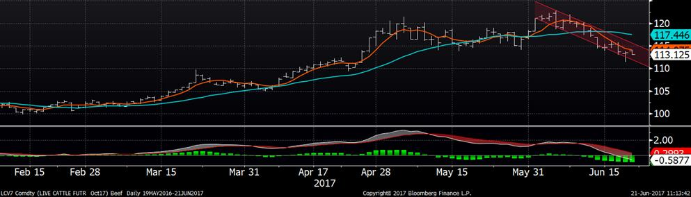 Le CaT de bœuf demeure dans sa tendance baissière et a touché un nouveau creux de deux mois avant de remonter en après-midi pour effacer les pertes. L'exception a été le contrat de juin, qui a augmenté de +0.35¢/lb à 120.35¢/lb. Le mois d'août s'est établi à 115.90 ¢ et octobre à 113.50 ¢.Les prix des découpes en après-midi affichaient une baisse de -2.47¢/lb pour le Choice et -1.48¢/lb pour le Select, mais la marge des abattoirs a été estimée à 202$US/tête, en hausse par rapport à la marge déjà élevée de 165$US/tête lundi. Les CaT ont été influencés par les attentes d’un prix cash plus faible cette semaine malgré les marges phénoménales des abattoirs et les prix plus faibles du bœuf. Le géant abattoir JBS essaie de trouver un acheteur pour sa filiale nord-américaine d'alimentation animale - Five Rivers Cattle Feeding - qui a une capacité d'environ 980 000 têtes, a également fait pression sur les prix au début de la session.