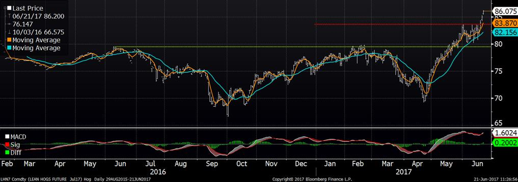 Le prix du porc a été propulsé à la hausse grâce à la force du prix cash hier, ainsi que les découpes qui touchent un nouveau sommet. Juillet a fini la journée avec un hausse de 1.10¢/lb à 85¢/lb et c’est qui a permis de conclure un nouveau sommet. L’échéance d’octobre a vu touché un nouveau sommet en terminant la journée avec un hausse de +0.33¢/lb à 81.65¢/lb. Le prix cash continuent d’augmenter à une cadence « grand V », l’indice CME cash augmentera à 88.03 ¢/lb demain matin (+1.47 ¢/lb) pour atteindre un sommet de 2 ans et demi. Cela donnera un prix de 237.70 $CA/100kg. Pendant ce temps, la valeur de découpe de la carcasse de porc a bondi de 2.28 ¢/lb, avec un gain de + 6 ¢ sur le bacon.